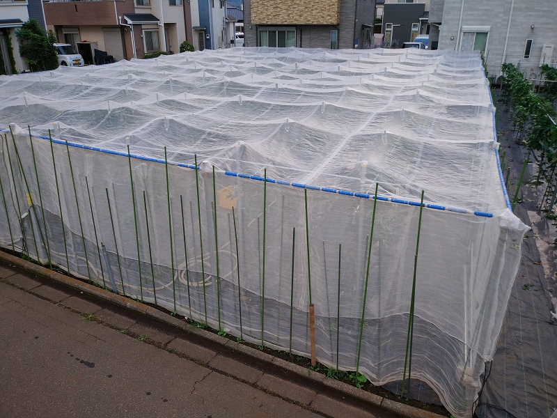 ネット栽培3年目 今年は雲り雨が多いのが少し気になる所ではありますが、風をふせいでいるので実の表面はとてもきれいです。